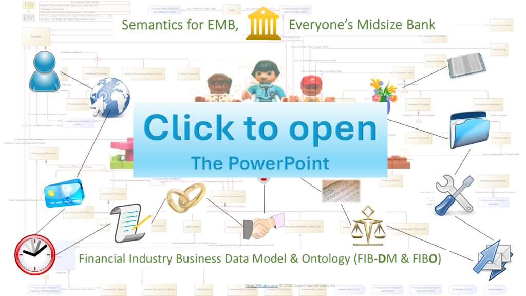 The presentation was derived from a custom overview of the FIBO data model for a European retail and commercial bank. While every bank and data architecture team is different, challenges and solutions apply to most banks of similar size and semantic technology sophistication. This general introduction addresses the generic Everyone’s Midsize Bank, EMB.